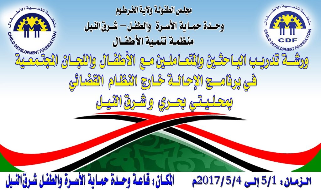 Khartoum sub-office’s Director, Huyam Omar said during the opening ceremony of the workshop in Bahari and eastern Nile localities, that organized by Khartoum sub-office in collaboration with Council of childhood in Khartoum, family and child protection unit in eastern Nile locality, on the referral program outside of the judicial system in the period from 01 May to 04/May/2017, she said that the workshop aimed to establish a new mechanisms for training and implementation of referral programs outside the judicial system within local communities, she indicated that the workshop targets fifty leaders of protection committees, and the teachers dealing with children in Bahari and eastern Nile localities, to activates the role of the local community in social reconciliation, and reducing child visible cases by the judiciary.
